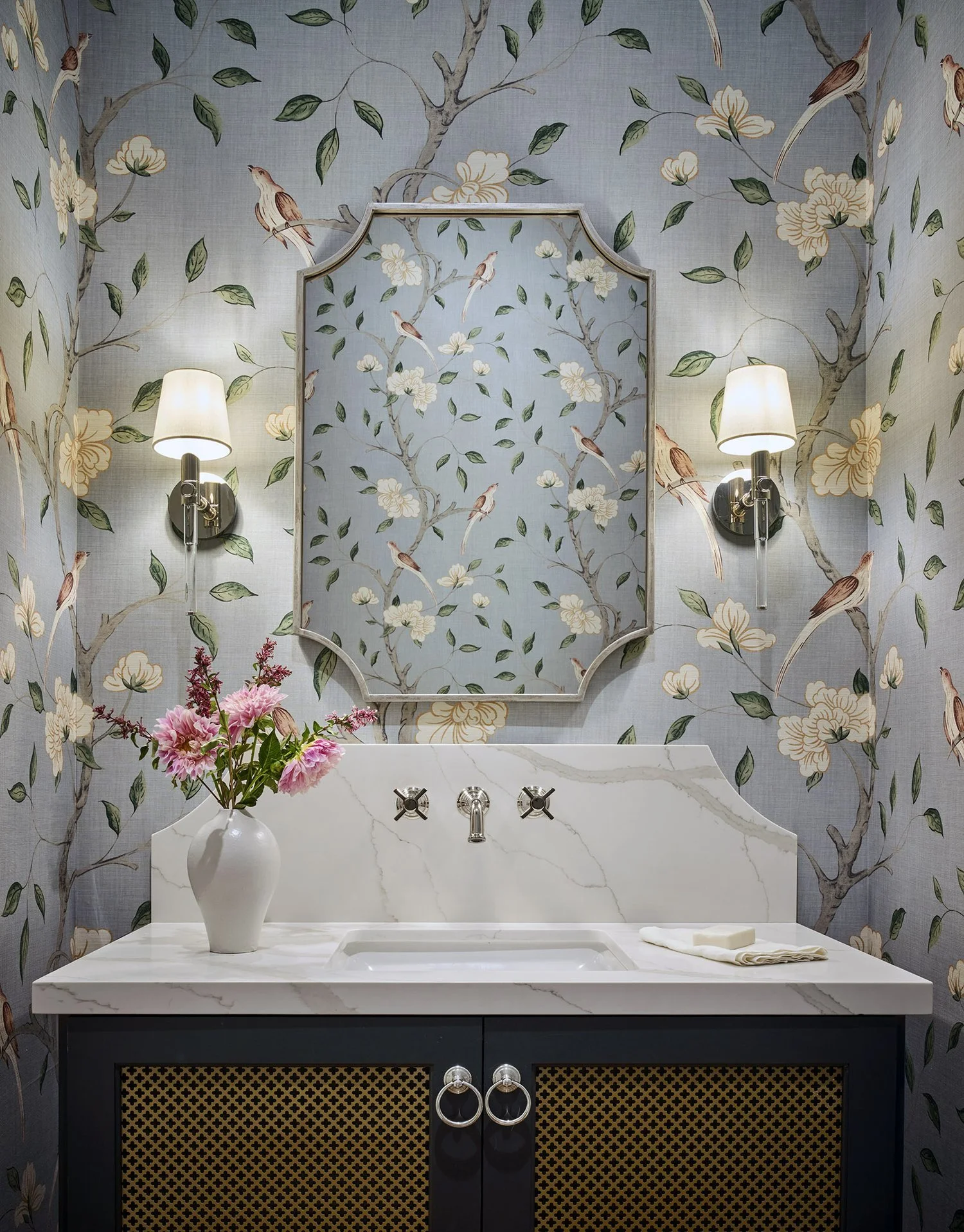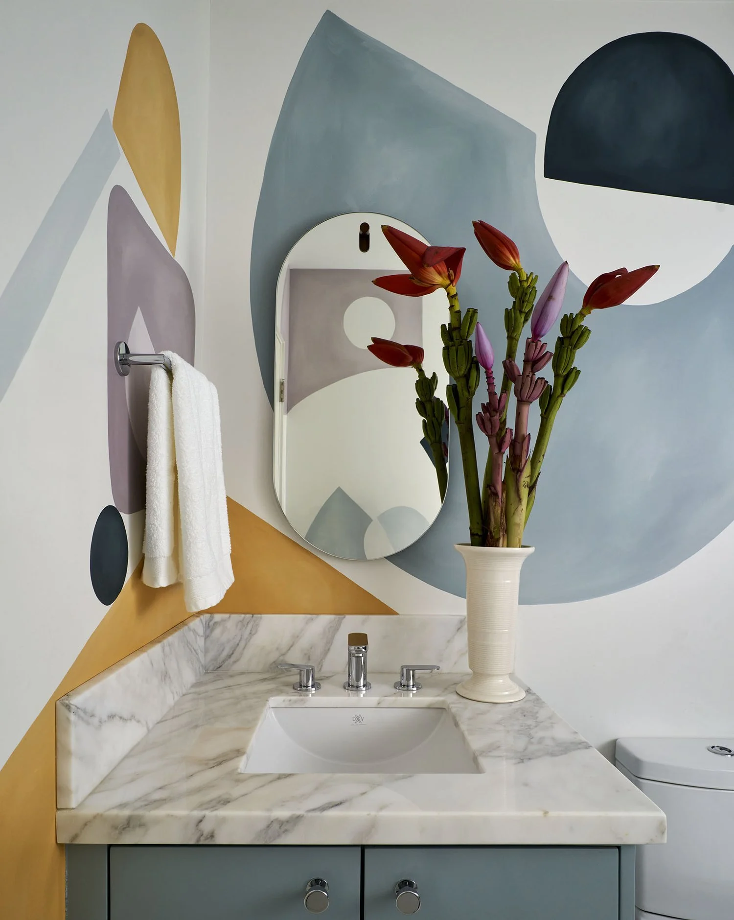 I love playing with shapes, like in the powder room above. I had geometric forms hand painted on the wall and I wanted a mirror that would be a perfect complement to that theme. The narrow oval shape I designed balances the patterns without competing with them.