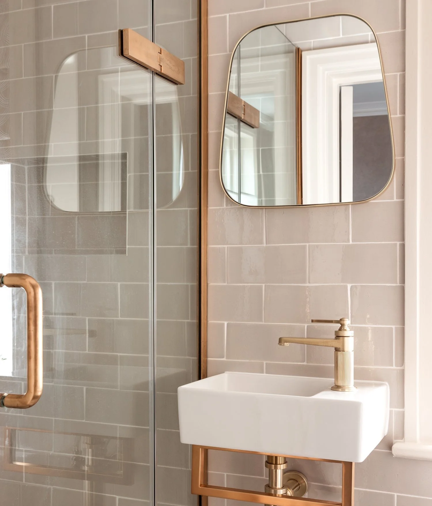 Taking a unique twist on the usual square or rectangular shape, I found this fantastic mirror that has clipped corners. The shapely turn complements the curve on the marble backsplash and adds a lot of visual interest.